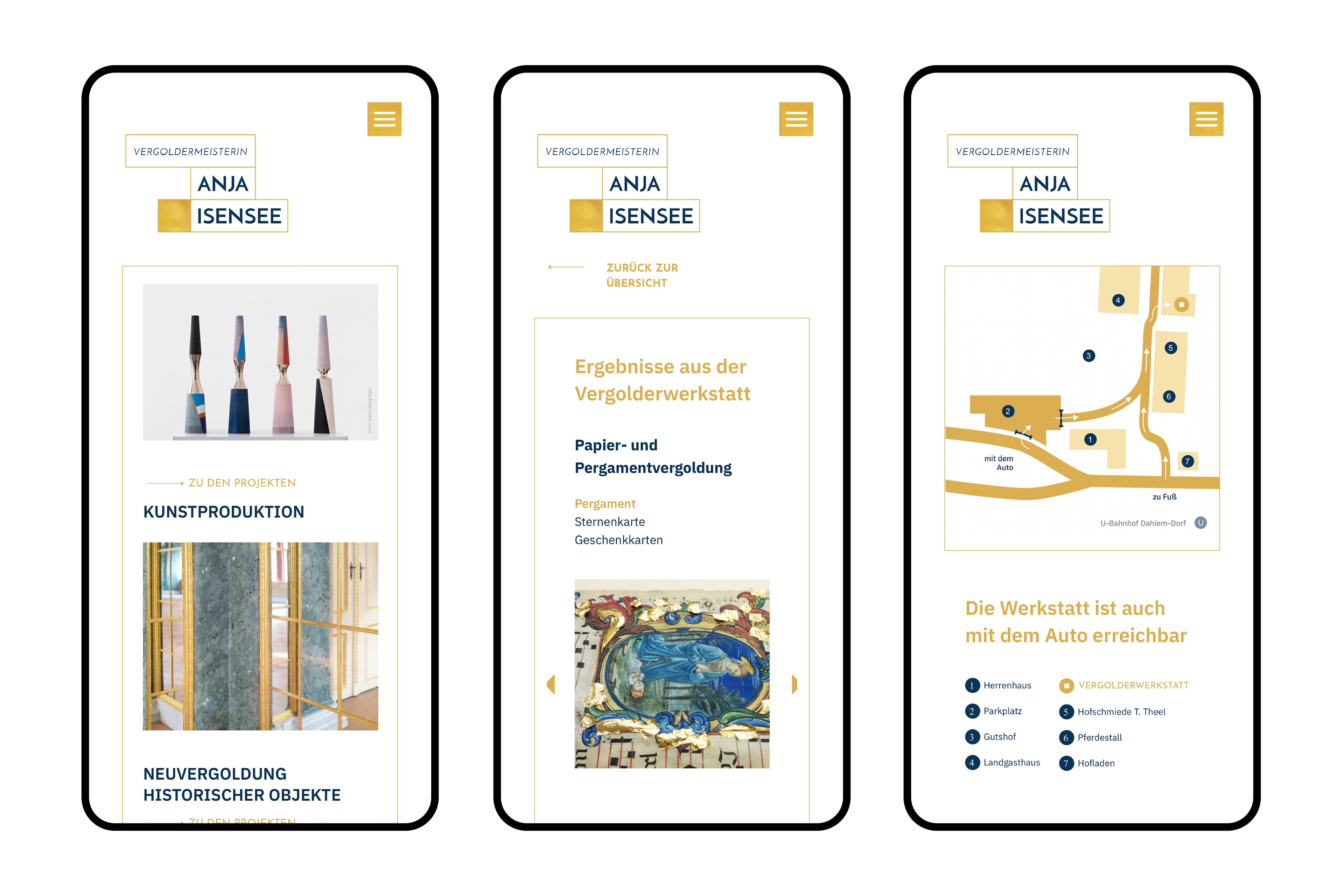 Auf dem Gelände der Domäne Dahlem in Berlin befindet sich die Werkstatt der Vergolderin Anja Isensee. Die Meisterin dieses traditionellen Handwerks bietet sämtliche Vergoldertechniken mit Blattmetallen auf unterschiedlichsten Untergründen, wie Holz, Metall, Stein oder Stoff an. Von der großen Kirchenuhr mit vergoldetem Ziffernblatt bis hin zum vergoldeten Kinderschuh umfasst ihr Portfolio eine beeindruckende Bandbreite an Handwerkskunst. Das neu konzipierte Corporate Design übt sich in Zurückhaltung und bietet eine Bühne für die eindrucksvollen Referenzen der Vergoldermeisterin.