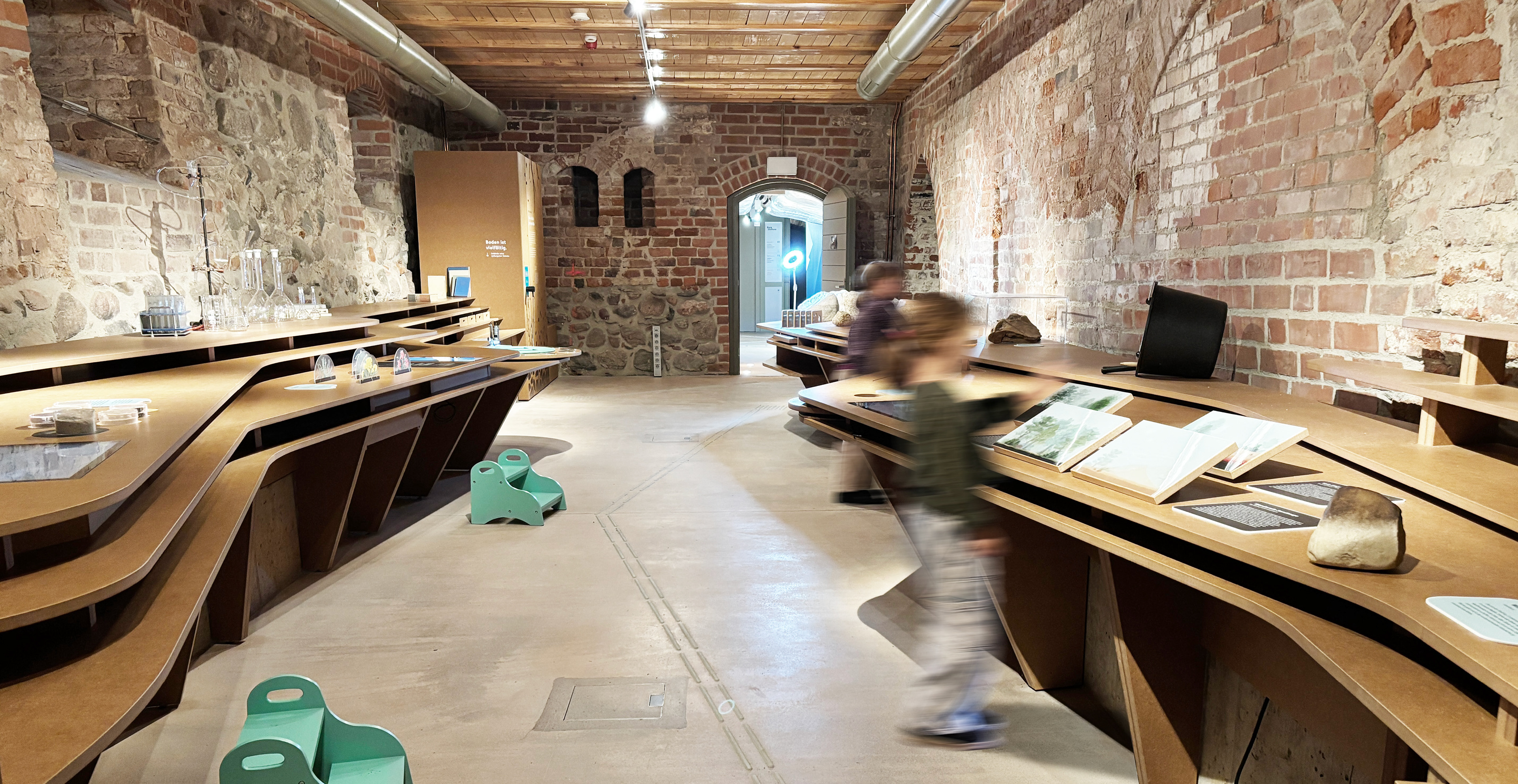 Die süd-östlich von Berlin gelegene Burg Storkow bietet ihren Besucher:innen eine spannende Entdeckungsreise durch drei barrierefreie Ausstellungsebenen. Erlebnisräume, wie die „Gletscherhöhle" oder das „Bodenlabor" animieren dabei mit vielen interaktiven und multimedialen Stationen zum Mitmachen. So werden geologische Prozesse, ökologische Wechselwirkungen und kulturelle Entwicklungen anschaulich erfahrbar.