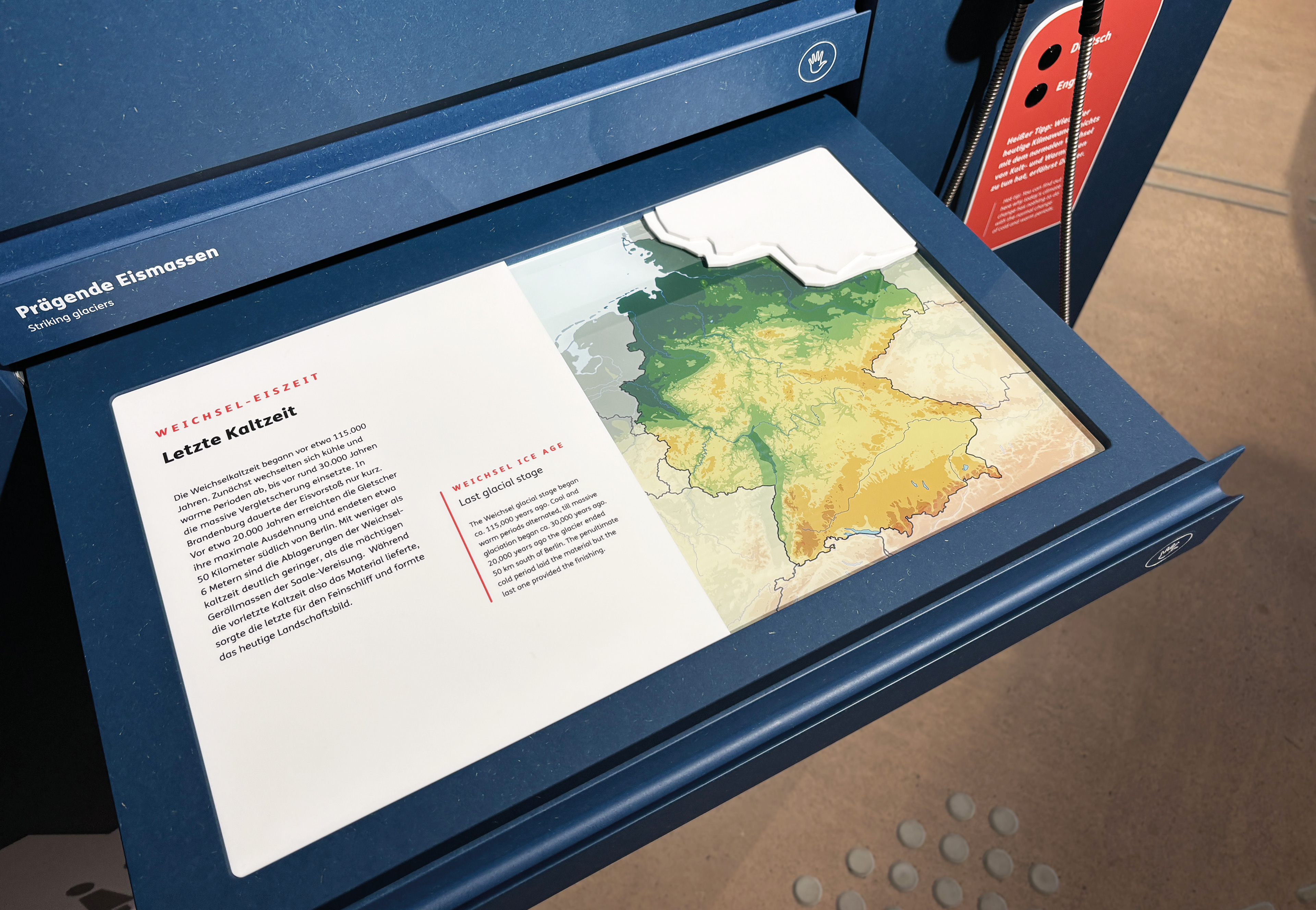 Eine Besonderheit bietet die Dauerausstellung für nicht sehende Besucher:innen: Viele Grafiken und Karten sind haptisch erlebbar und ermöglichen ein eigenständiges Ertasten der Inhalte. Ergänzt werden sie durch die Übersetzung der Ausstellungstexte in Braille-Schrift, tastbare Modelle und Audiostationen. Auf diese Weise wird die Ausstellung auch für nicht sehende Besucher:innen zugänglich und bietet ihnen einen gleichwertigen Zugang zu den Geschichten dieser Region.